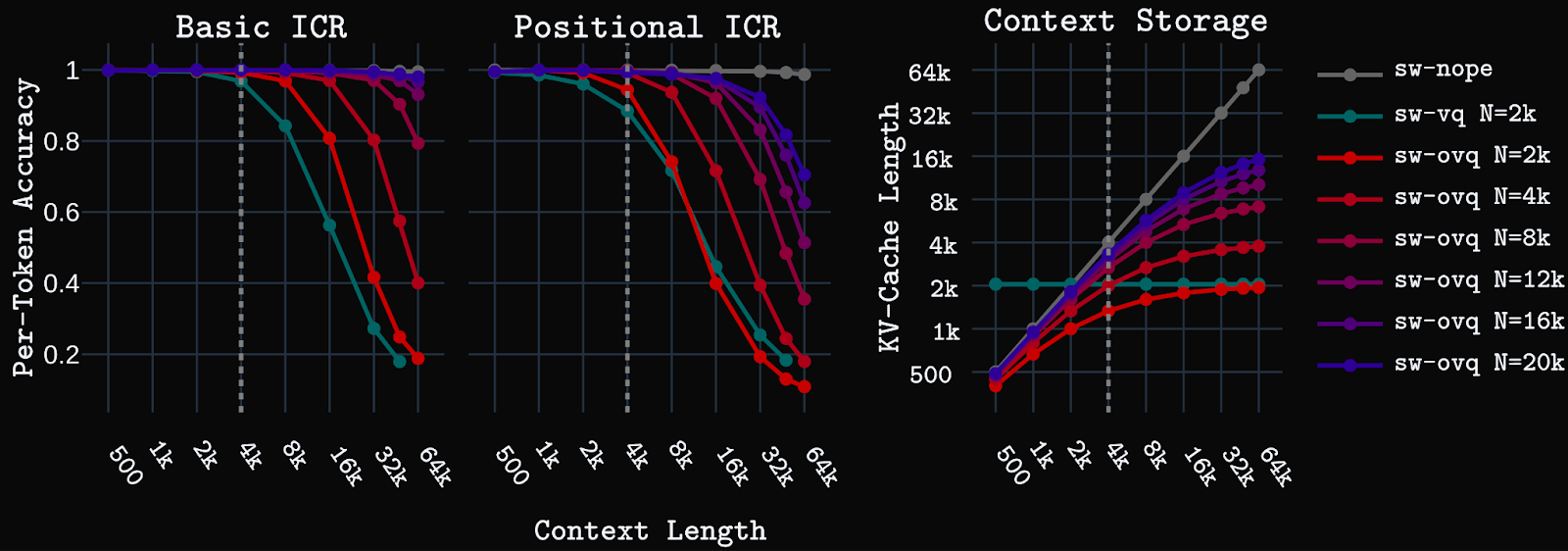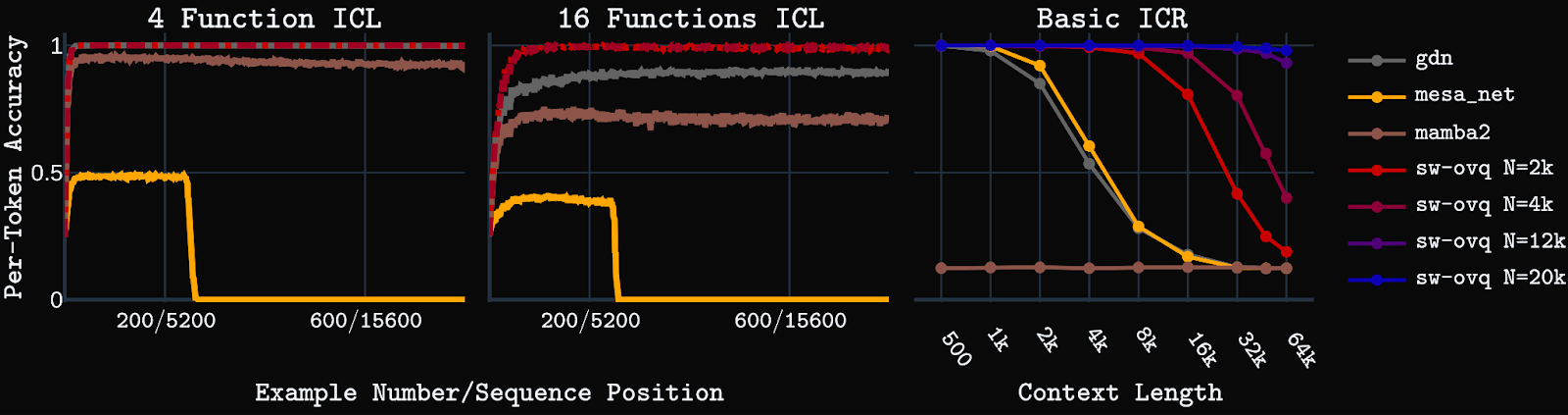 We first test the models on synthetic key-value in-context retrieval (ICR) tasks. Basic ICR is a simple key-value retrieval task that requires retrieving a value for a given key from a pool of unique key-value pairs shown in context. Positional ICR, a harder task, requires retrieving an ordered set of values assigned to a particular key in the context. Models are trained with up to 4k context length, then tested up to 64k context.